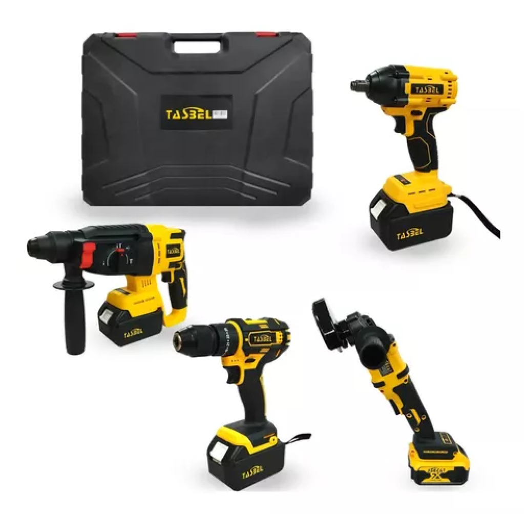 JUEGO DE HERRAMIENTAS ELÉCTRICAS INALÁMBRICAS KIT DE HERRAMIENTAS TALADRO AMOLADORA MARTILLO ATORNILLADOR BS-004 4 PIEZAS Y MALETÍNTaladro eléctrico inalámbrico, juego de herramientas de mano, kit combinado de llaves de impacto eléctricas sin escobillas, martillo, taladro y amoladora.ESPECIFICACIONES:* Nombre del producto: Kits combinados de herramientas eléctricas.* Color: Azul con Negro.* Con accesorios.* Cantidad de Herramientas: 4.PAQUETE INCLUYE:* 1 Taladro* 1 Amoladora* 1 Atornillador* 1 Martillo* 2 Baterías